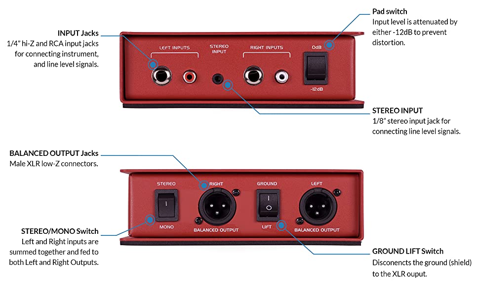 The MD2 Pro features two of Samson's STLX Mu-Metal shielded transformers that deliver an extended, flat frequency response with ultra-low distortion and superior protection against hum and RF interference. The MD2 Pro's balanced outputs provide clean signals that are less susceptible to noise than unbalanced lines, allowing for longer cable runs. The MD2 Pro also includes a 3-position 0dB/-10dB/-20dB attenuation switch for each input to toggle between line and speaker level signals, as well as a Stereo/Mono sum switch.
