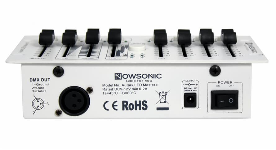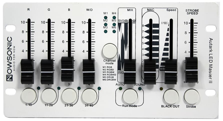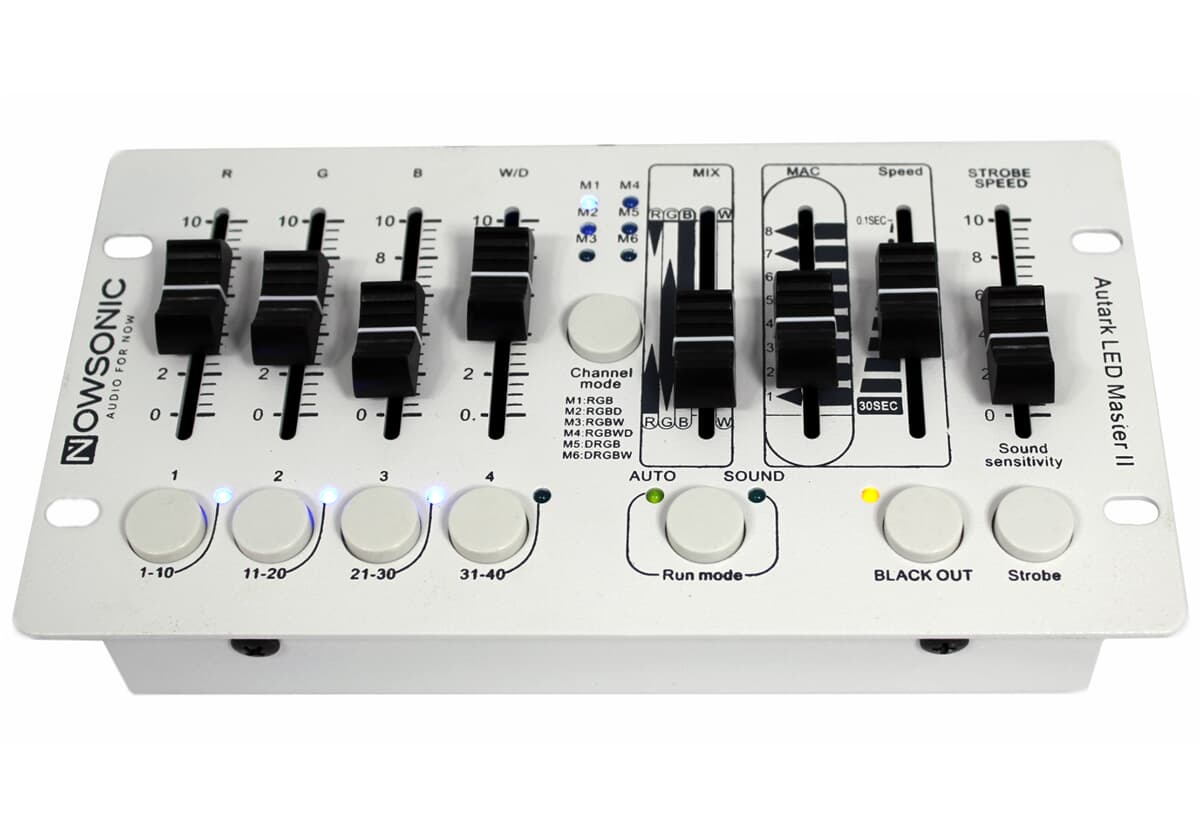 The Nowsonic Autark LED Master II is an extremely compact and innovative DMX controller for LED floodlights like the Nowsonic Autark ID07 or Autark OD09. However, thanks to the DMX 512 protocol it is directly compatible with any floodlight products or PAR cans from third parties. You can easily configure the device for the six available channel modes (RGB, RGBW, RGBWM, DRGB, DRGBW and DRGB) with just one button press. The controller can address up to 40 channels via the DMX512 protocol. The individual color channels can be controlled via the faders for the R, G, B and W/D color components. You can trigger the internal pre-configured color mixtures via a separate MIX fader. The MAC fader allows to choose one of the 8 internal programs which then can be adapted in speed as needed. The internal programs can be controlled dynamically via the music signal; the sensitivity in Sound mode can be adjusted, if needed. The Strobe mode is activated by a button press, the strobe speed is adjusted via an additional fader.