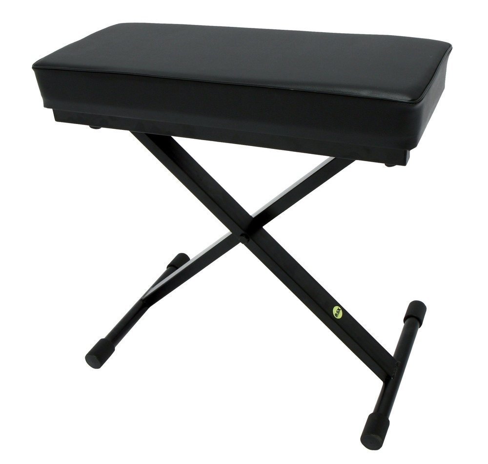 Udobna, oblazinjena in po višini nastavljiva kovinska klop, primerna za igranje klavirja ali klaviatur.