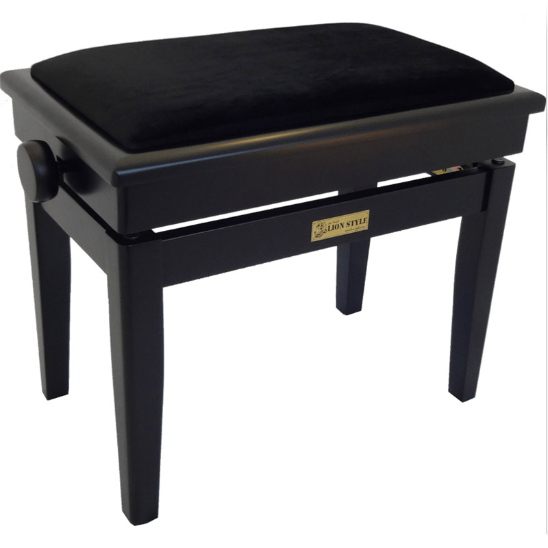 Masivna, po višini nastavljiva klop za klavir s predalom za literaturo in sediščem in velurja.