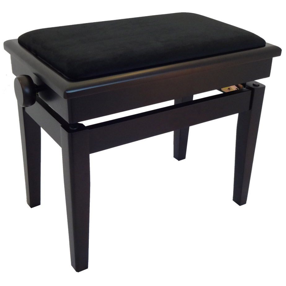 Masivna, po višini nastavljiva klop za klavir s predalom za literaturo in sediščem in velurja.