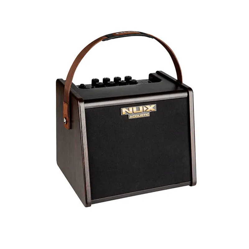 NUX AC-25 je kompakten akustični ojačevalec z vgrajeno akumulatorsko baterijo, ki deluje do 4 ure! Opremljen je s 6,5-palčnim zvočnikom, modelirnimi predojačevalci, reverbom, Bluetooth povezavo in drum machine. Nastavite ga lahko prek aplikacije Stageman APP na mobilnem telefonu. Dvokanalna konfiguracija pomeni, da lahko priključite dinamični mikrofon in svojo akustično kitaro. Predvajate lahko preko Bluetooth Audio Stream ali AUX vhoda.
