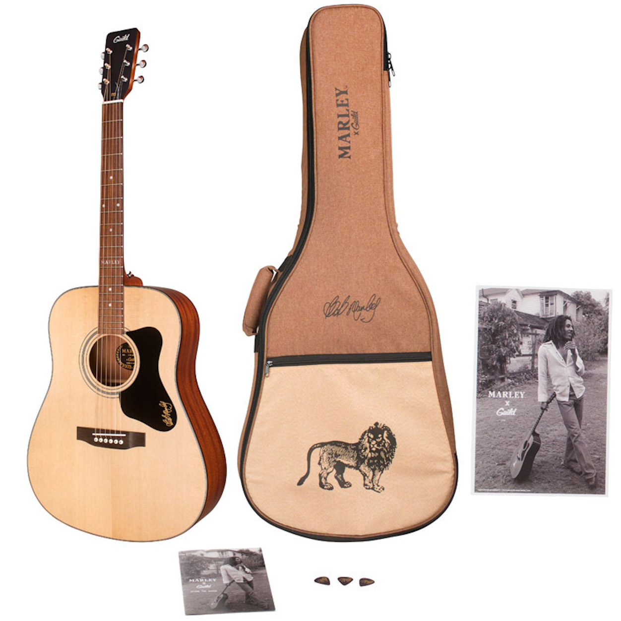 Priložene so še tri custom trzalice in poster Boba Marleya in njegove originalne kitare, za spomin na enega največjih songwriterjev vseh časov.