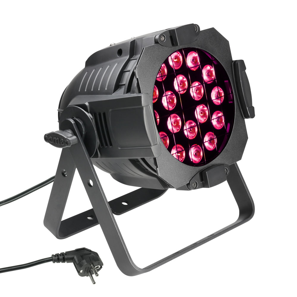Professional Studio PAR with 18 ultra-bright 3-Watt TRI LEDs in a sturdy, black aluminium housing with a beam angle of 25 degrees.