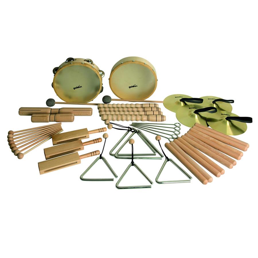 46-delni komplet tolkal s torbo, ki bo zaposlil cca 24 otrok.5 x 33010 par zvenečih palic 18x200(par)1 x 33100 tonski blok mali1 x 33110 tonski blok velik4 x 33160 tonska palica3 x 33310 tonski blok z držalom3 x 33700 triangel 10cm2 x 33703 triangel 15cm2 x 34100 ročne činele 15cm (par)1 x 35275 tamburin 20cm1 x 35325 tamburin 20/75 x 36010 lesena udarjalka 20mm2 x 36010 udarjalka filc 35mm