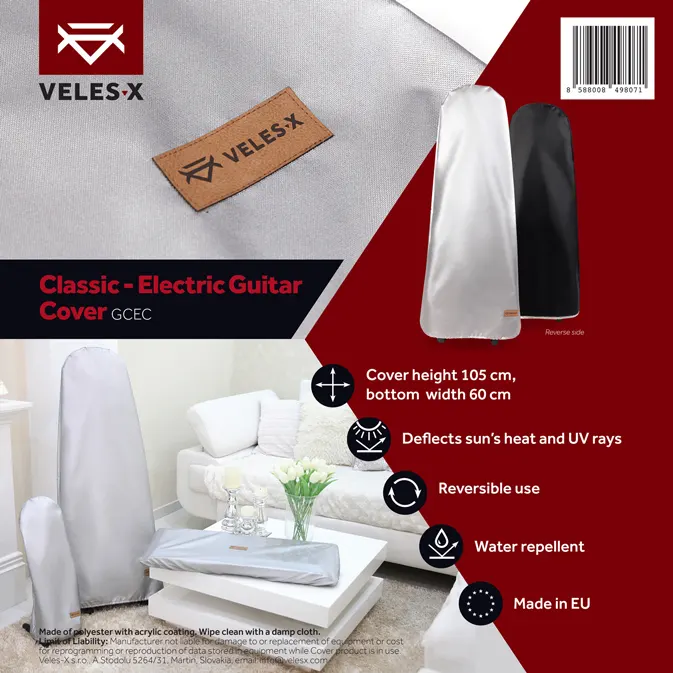 Vaše glasbilo je pomembno, zato ga zaščitite pred prahom, umazanijo in soncem! To je univerzalno obojestransko pokrivalo za klasično/električno kitaro. Srebrna stran, primerna za uporabo na odru, preprečuje pregrevanje instrumenta in odbija UV-sevanje ter tako zagotavlja trajnost prvotne barve instrumenta. Črna stran služi kot protiprašna prevleka za domačo uporabo. Spodnji del pokrivala za klasično/električno kitaro je opremljen z elastičnim trakom, zato popolnoma obdaja vaš instrument. Ta izdelek je odporen na vodo, s čimer preprečuje neželene poškodbe na pokritem glasbilu. Primeren za večino klasičnih in električnih kitar (za polakustične oblike ali druge nestandardne oblike električnih kitar glejte Pokrivalo za akustično kitaro Veles-X). Čistite samo z vlažno čisto krpo.