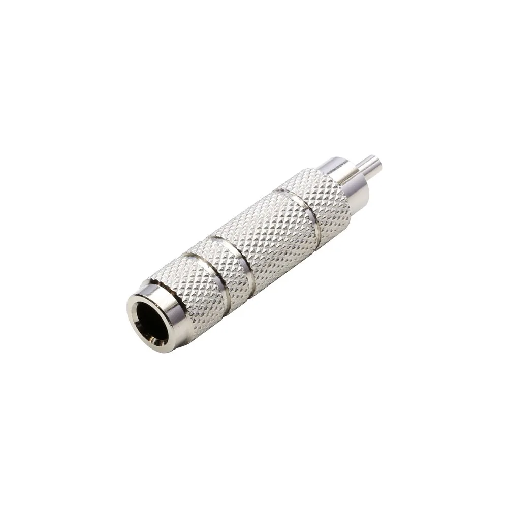 Kovinski pretvornik, ki ima na eni strani 6,3 mm ženski mono jack konektor na drugi pa moški RCA konektor.