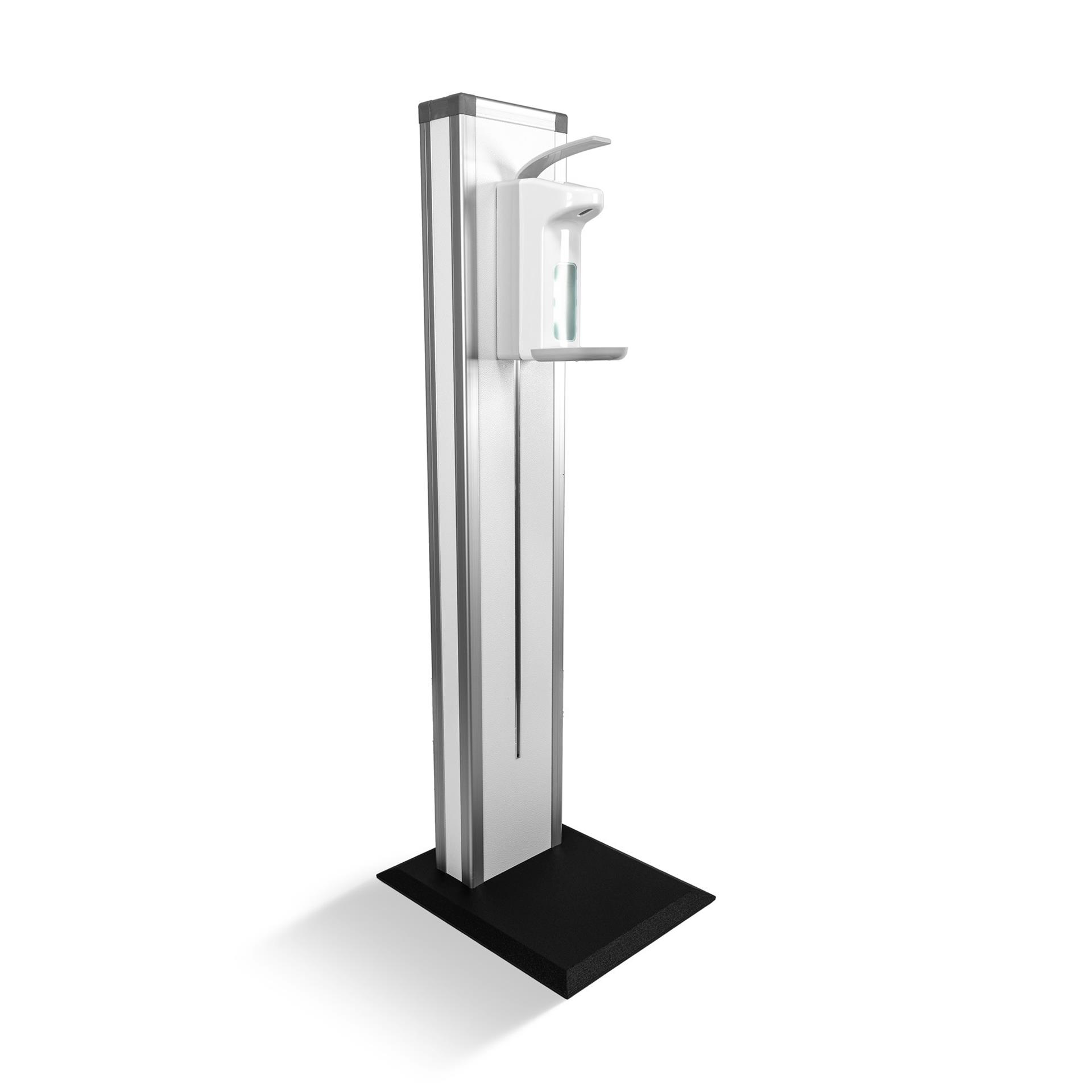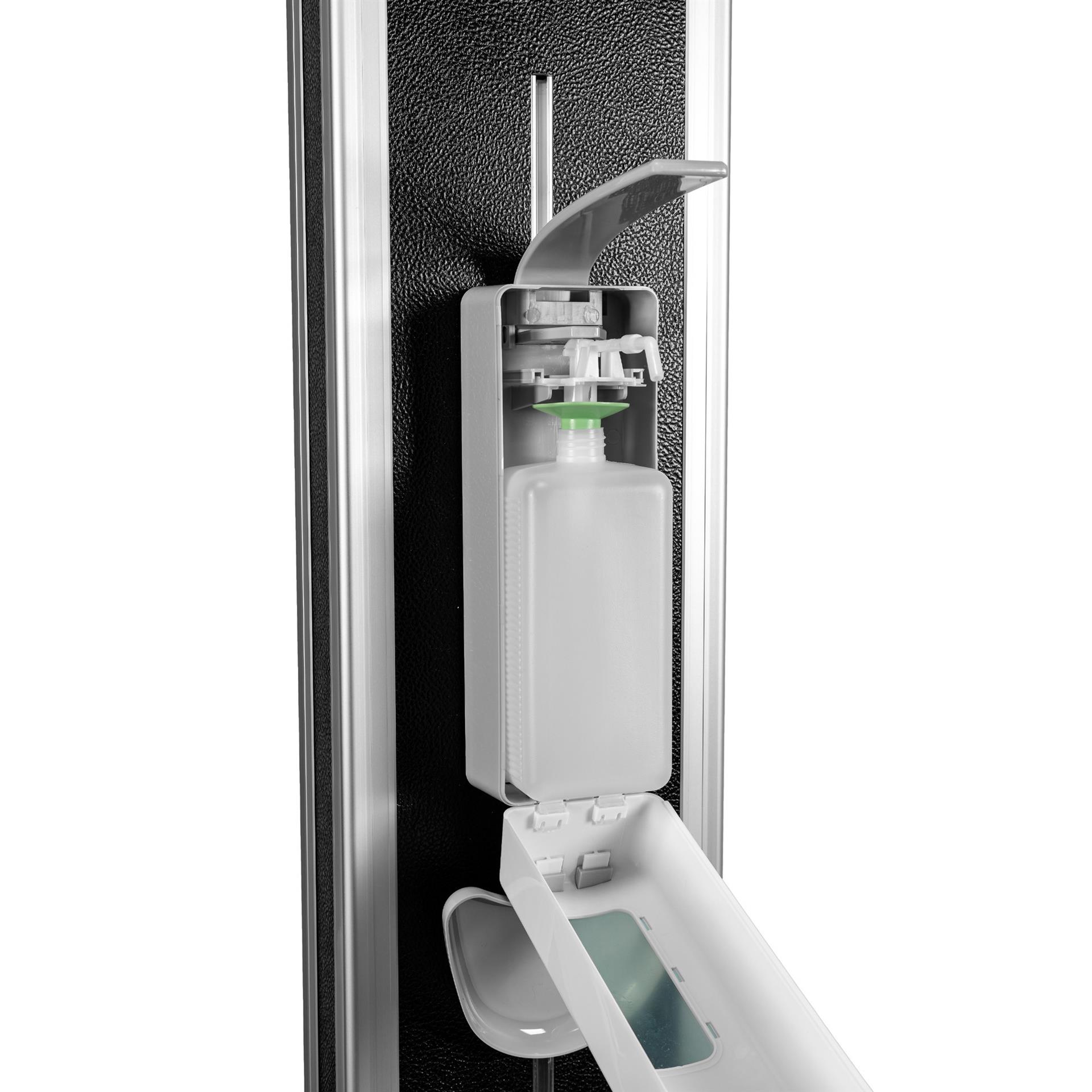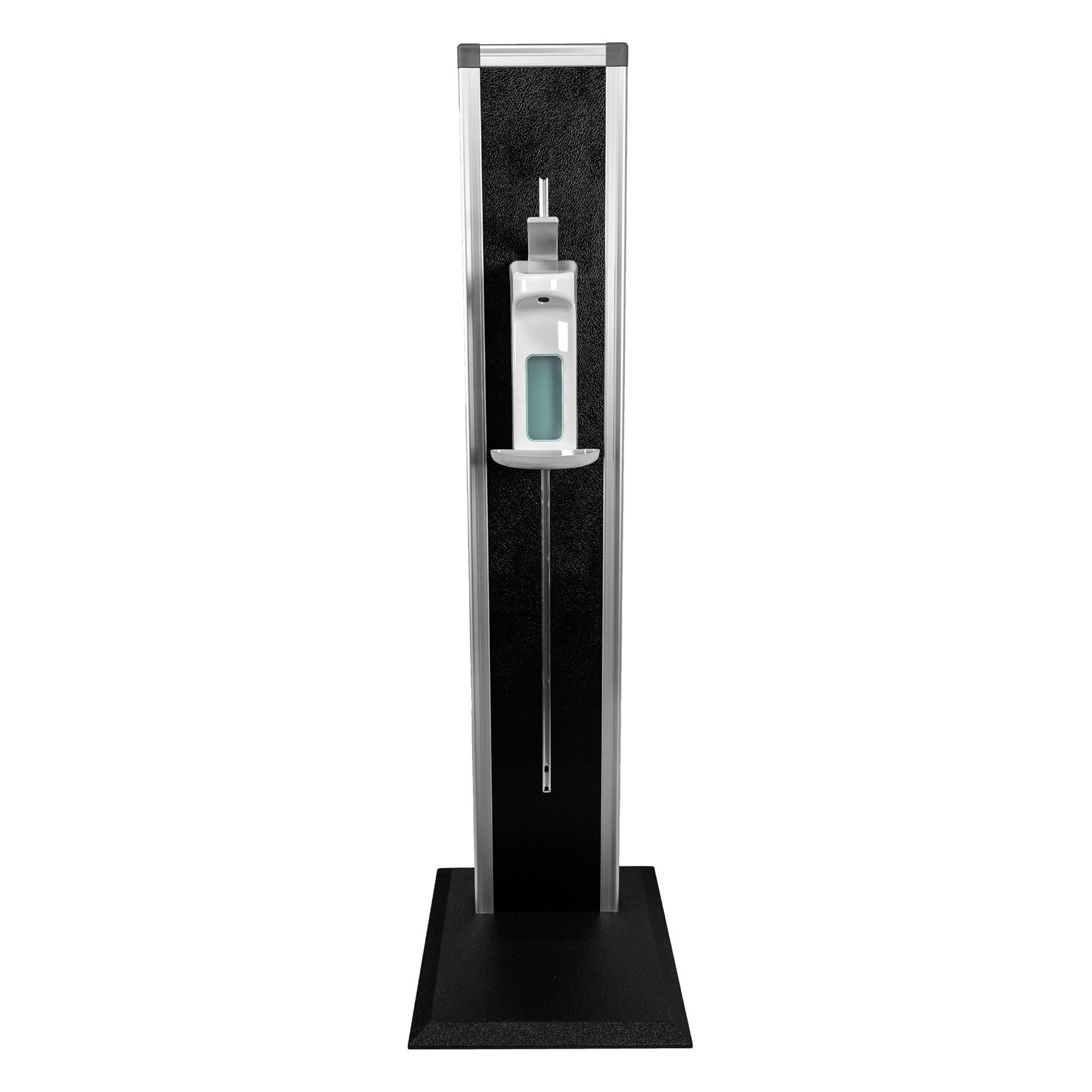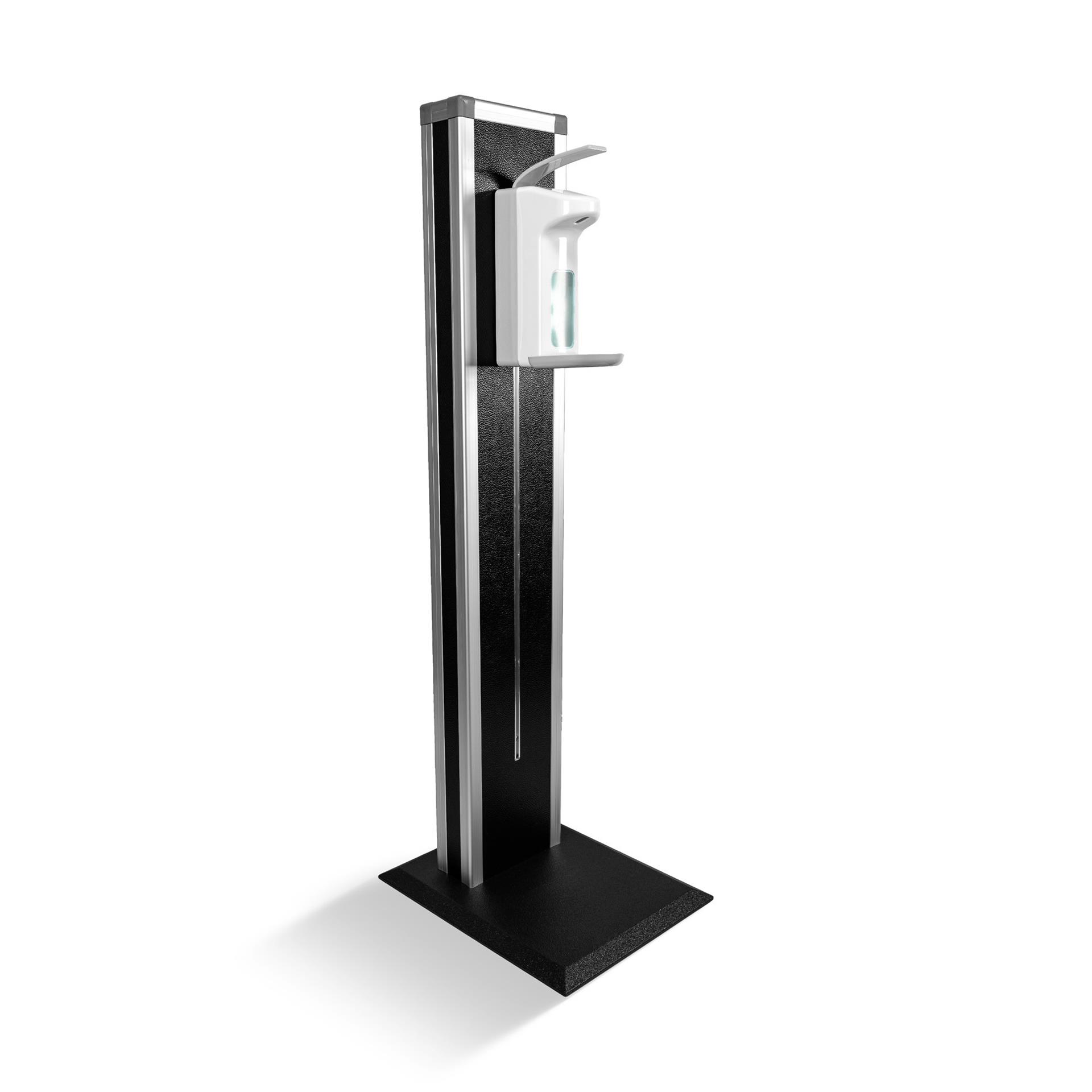 Stabilno in vizualno privlačno stojalo za razkužilo, po višini nastavljva razkuževalna postaja z vgrajenim dozerjem za razkužilo.