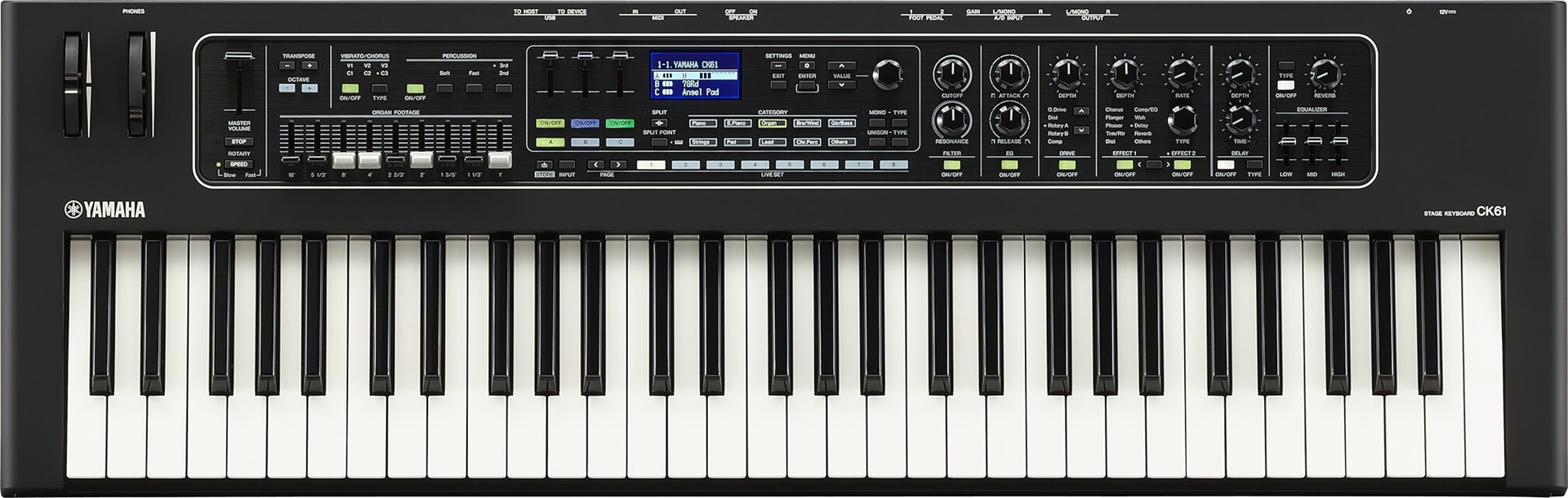 Yamaha je združila najboljše karakteristike serij CP stage piano in YC stage keyboard in ustvarila edinstveno klaviaturo, ki je cenovno zelo dostopna, a vseeno nudi vse profesionalne zvoke in funkcije, ki jih potrebujete na odru. CK serija prinaša intuitivno funkcionalnost, ki ste je vajeni pri Yamahi, nadgrajeno z vrhunskimi zvoki CP serije ter orgelskimi in synth zvok,i serije YC. Na voljo so drsniki za ustvarjanje zvokov (npr orgle) in vsa kreativnost osnaovana na synthetizatorju, 3-ban equalizer, direkten dostop do vsake kategorije instrumentov. CK61 in zelo odzivno FSB klaviaturo, s katerimo boste zares uživali ob igranju orgel, električnih klavirjev in synth zvokov. Za razliko od večine synthetizatorjev ima CK61 vgrajene zvočnike, A/D vhod, 4 zone za MIDI kontrolo, Bluetooth vhod in možnost delovanja tudi na baterije!