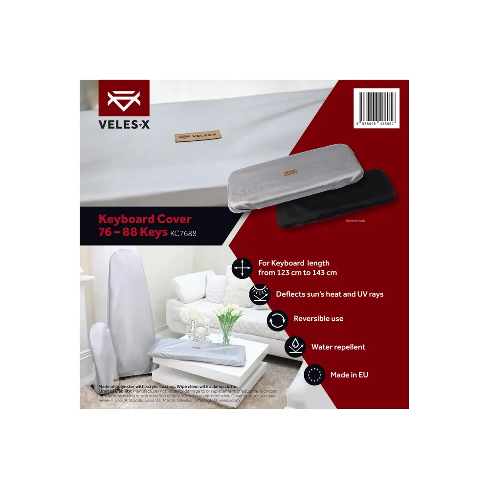 Vaše glasbilo je pomembno, zato ga zaščitite pred prahom, umazanijo in soncem! To je univerzalno obojestransko pokrivalo. Srebrna stran, je primerna za uporabo na odru, preprečuje pregrevanje instrumenta in odbija UV-sevanje ter tako zagotavlja trajnost prvotne barve instrumenta. Črna stran služi kot protiprašna prevleka za domačo uporabo. Veles-X pokrivalo za klaviaturo 76-88 je primerno za instrumente od 123 cm do 143 cm. Elastični trak se prilagodi velikosti instrumenta. Velcro (ježek), ki se zapenja s spodnje strani inštrumenta pa služi za boljši estetski učinek, zato se pokrivalo popolnoma poda klaviaturi. Ta izdelek je odporen na vodo, s čimer preprečuje neželene poškodbe na pokritem glasbilu. Primerno je za večino klaviatur s 76-88 tipkami. Čistite samo z vlažno čisto krpo.